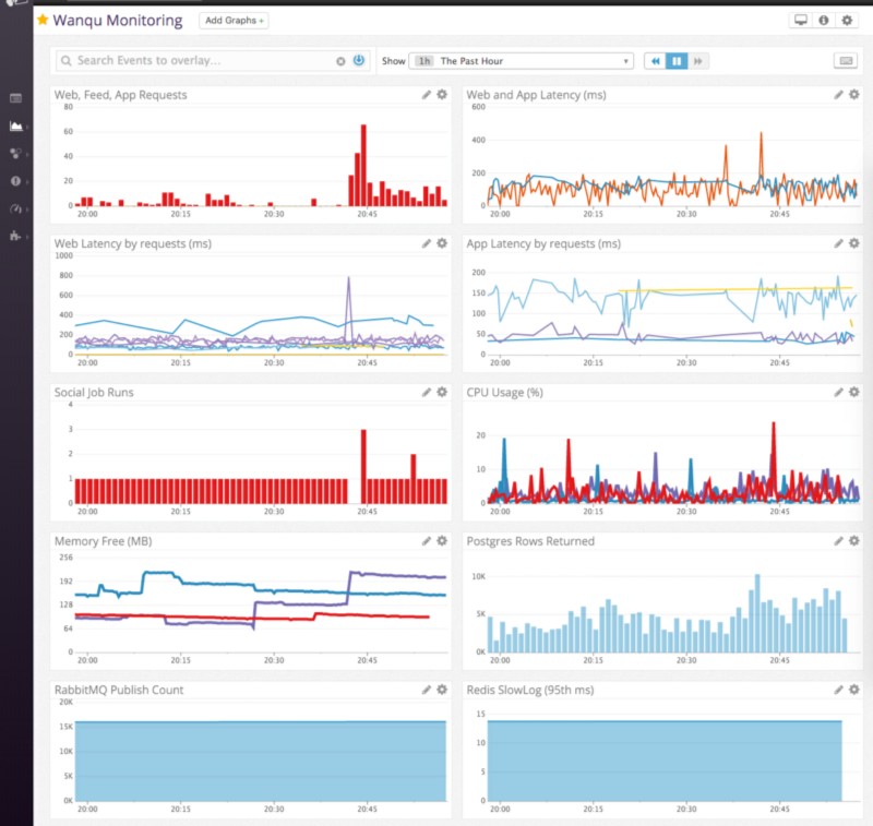监控网站是否挂了,我用的是 Pingdom;如果网站挂了,我会收到短信提醒。监控服务器各种计算资源的使用情况,我用的是 Datadog(2014年去开 Dockercon 的时候,在他们摊位聊了很久,才知道有这么个东西)--理论上,monitoring 与 alerting 都可以自己用开源软件搭建,但是,湾区日报只是一个 side project 而已,有现成可以凑活着用的SaaS方案,就不必花时间自己做了;而且自己做的肯定不如人家专业的。用 Datadog 可以方便地看到不同 endpoint 在特定时间段内的请求次数以及latency。详情请见:湾区日报是如何监控系统的健康情况的